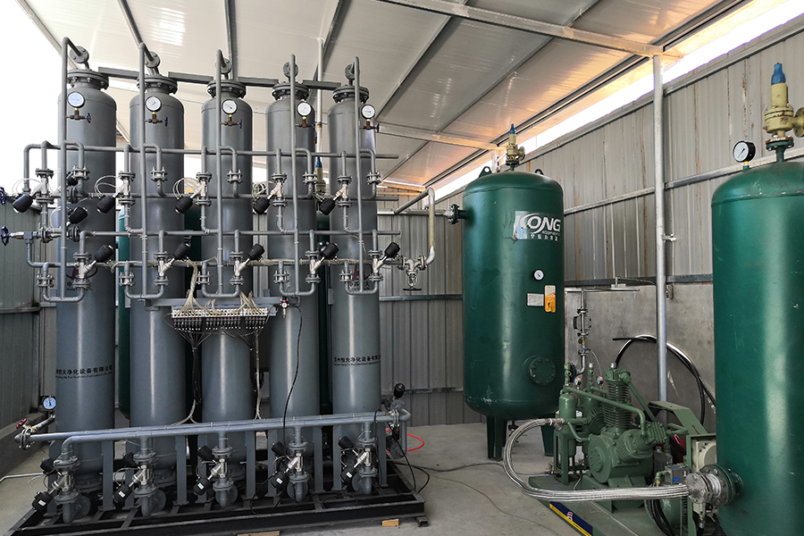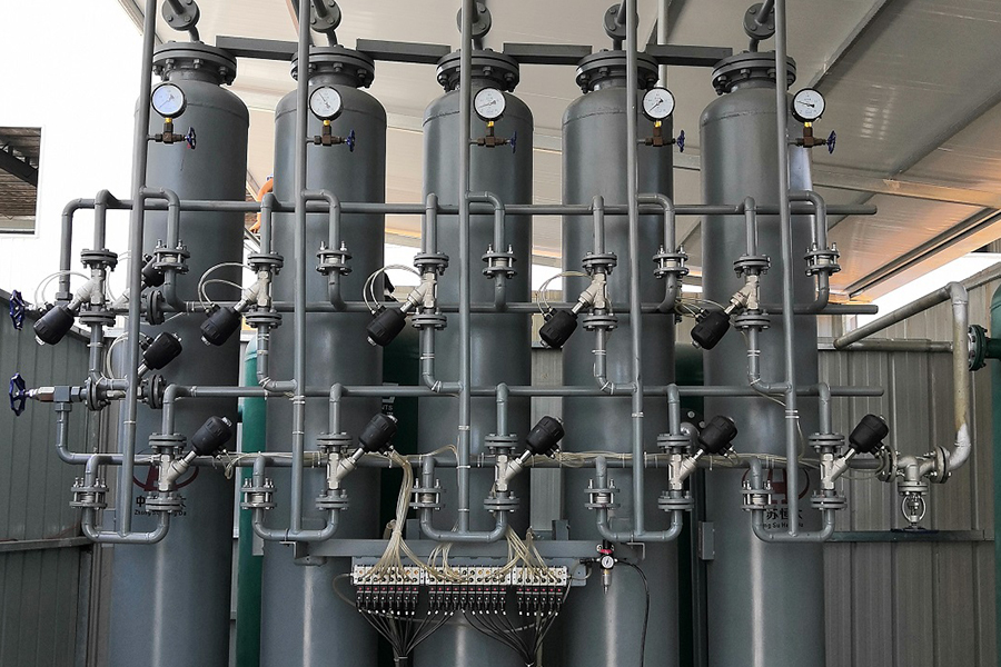 Ang hilaw na gas ay pumapasok sa isang hanay ng mga adsorbers at na -adsorbed at tuyo at ipinadala sa pamamagitan ng isang filter hanggang sa punto ng paggamit. Kumuha ng isang bakas na halaga ng gas ng produkto at muling buhayin ang mga adorbed na saturated molekular na sieves sa isa pang hanay ng mga adsorbers sa temperatura na 250 ° C-300 ° C. Ang dalawang hanay ng mga adsorbers ay gumagana at pagbabagong -buhay ay gampanan ng kahalili. Ang tuluy -tuloy at matatag na gas ng produkto ay maaaring makuha.